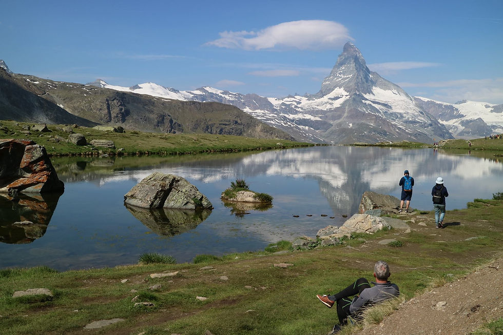 照片裡湖區映照的山就是大名鼎鼎的三角巧克力山:Matterhorn(馬特洪峰)。很顯然,這裡不是取景最好的角度,但很夠我悄悄拍下今天的主角:坐在照片右下角的Mr.Yang。